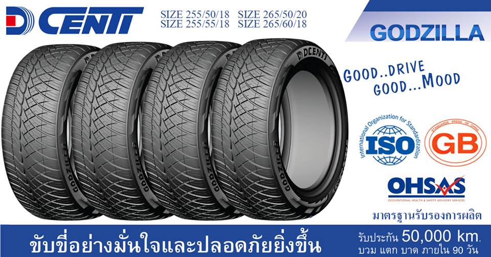 เปลี่ยนยางครั้งต่อไปอย่าลืมนึกถึงยาง Dcenti นะค่ะ เป็นยางผลิตประเทศไทย ยางไทยมั่นใจ 100% รับประกัน 50,000 กิโลเมตร บวม แตก บาด ภายใน 90 วัน เปลี่ยนเส้นใหม่ทันที!!! ได้รับมาตรฐาน ISO /GB / OHSAS ยาง Dcenti (ดีเซนติ) รุ่นGodzilla มี 4 ไซต์ ได้แก่ 265/50ZR20 , 255/50ZR18 , 255/55ZR18 และ 265/60ZR18